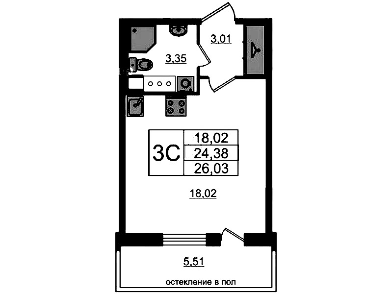 Квартира-студия на 5-ом этаже 24,38 кв.м