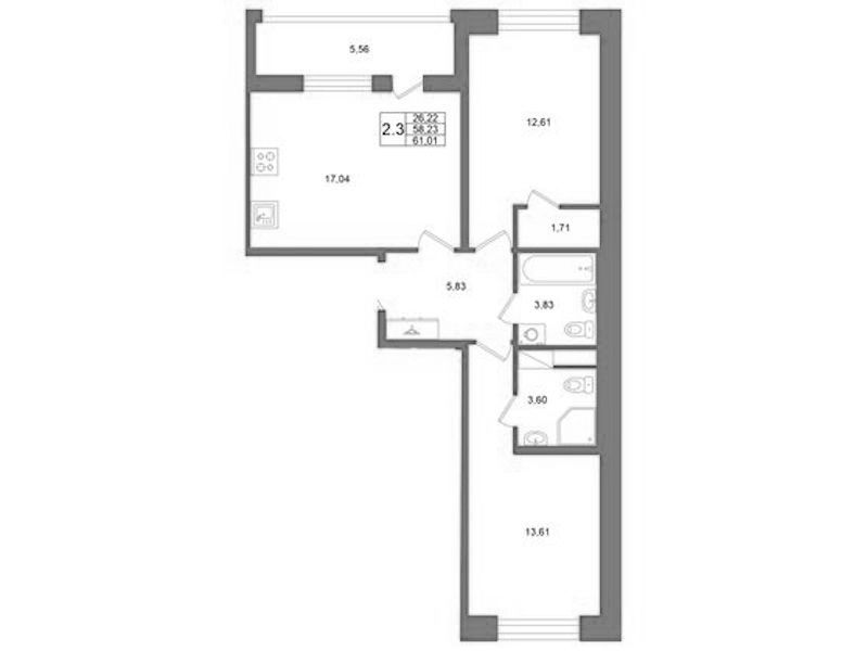 Двухкомнатная квартира на 12-ом этаже 58,23 кв.м