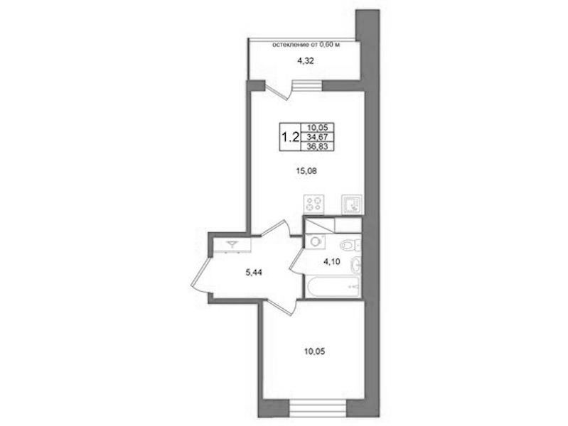 Однокомнатная квартира на 2-ом этаже 34,67 кв.м