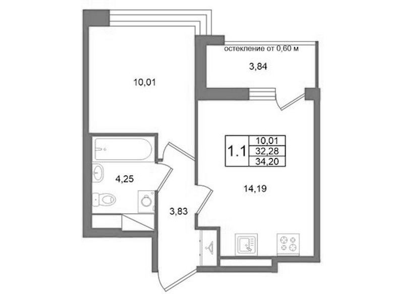 Однокомнатная квартира на 2-ом этаже 32,28 кв.м