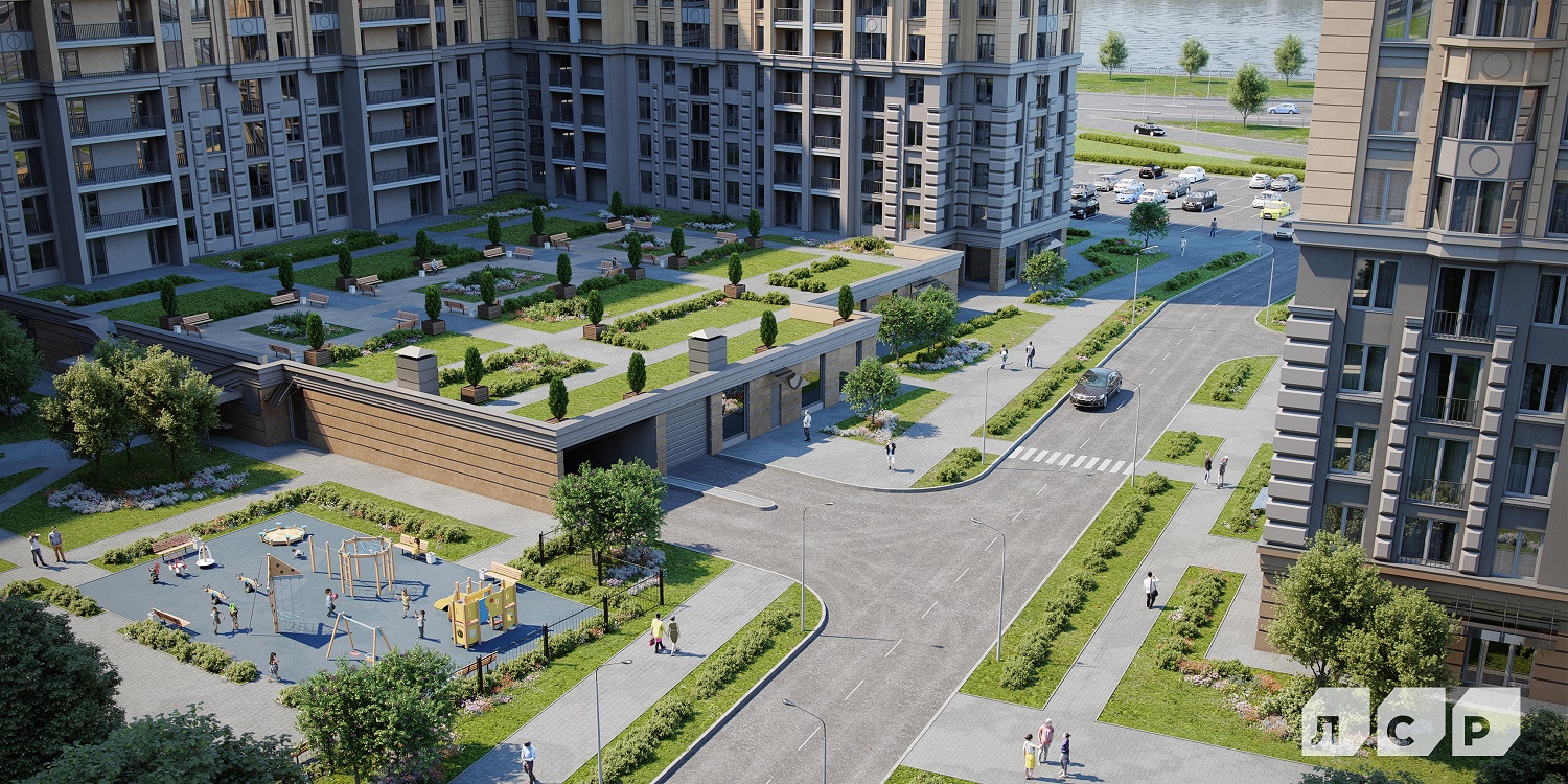 - На придомовой территории появятся тренажерные и детские площадки, зоны для отдыха взрослых и детей. Ландшафтная концепция предполагает разбивку прогулочной аллеи и благоустройство набережной.