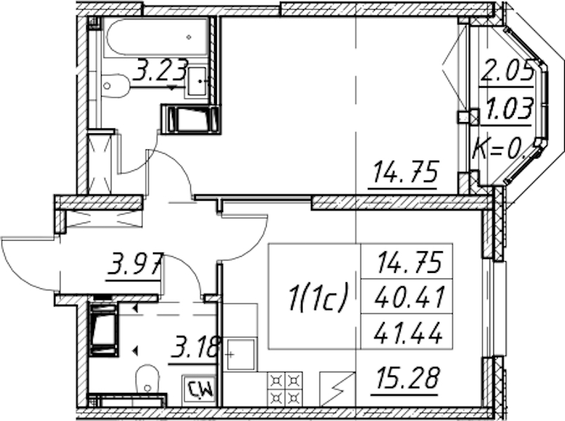 - Площадь41,44 м2