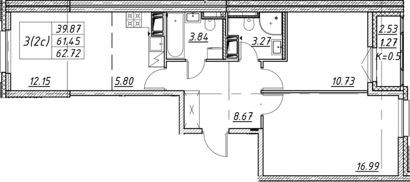 Двухкомнатная квартира на 12-ом этаже 62,72 кв.м