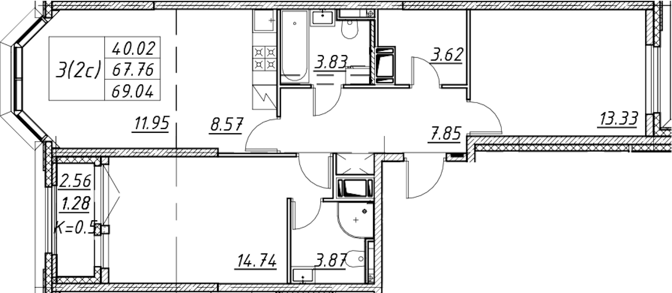 Двухкомнатная квартира на 6-ом этаже 69,04 кв.м