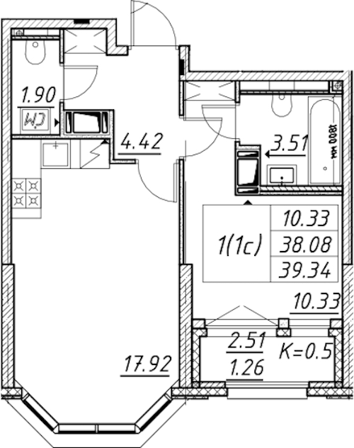 Однокомнатная квартира на 10-ом этаже 39,34 кв.м