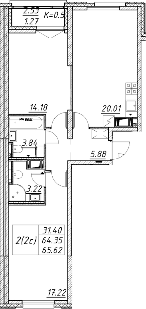 Двухкомнатная квартира на 12-ом этаже 65,62 кв.м