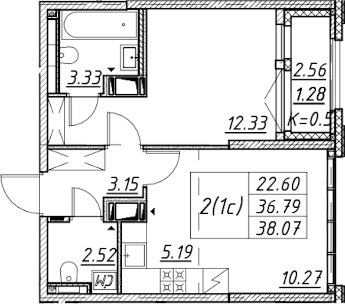 Однокомнатная квартира на 15-ом этаже 38,07 кв.м