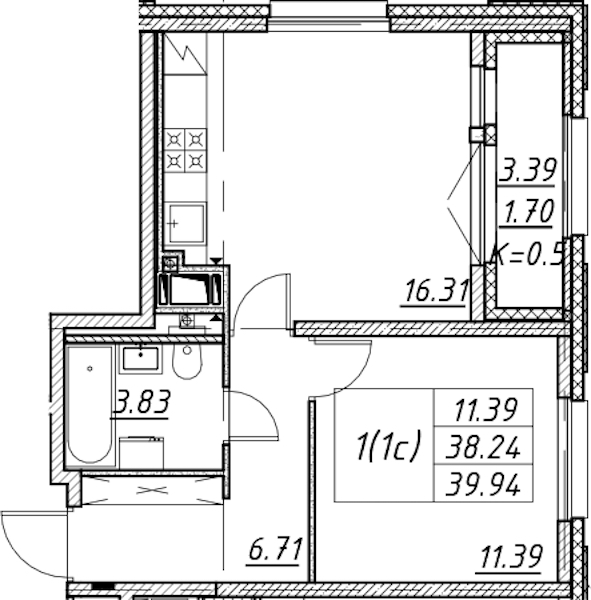 Однокомнатная квартира на 8-ом этаже 39,94 кв.м