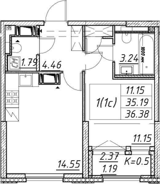 Однокомнатная квартира на 16-ом этаже 36,38 кв.м