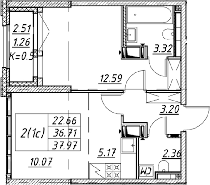 Однокомнатная квартира на 16-ом этаже 37,97 кв.м