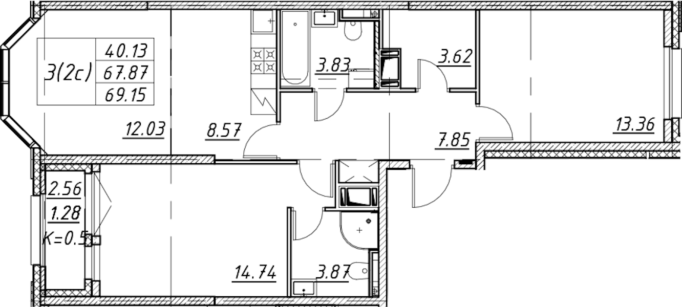 Двухкомнатная квартира на 7-ом этаже 69,15 кв.м