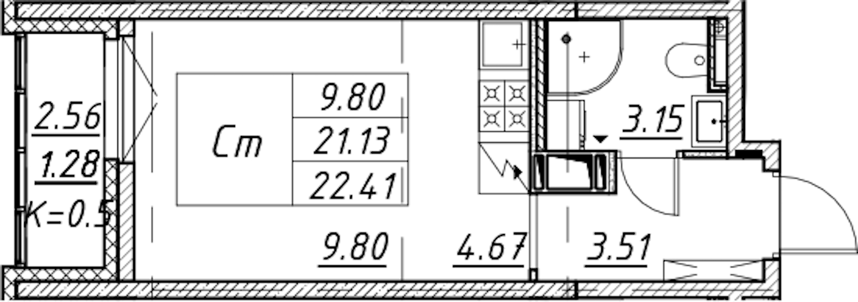 Квартира-студия на 16-ом этаже 22,41 кв.м