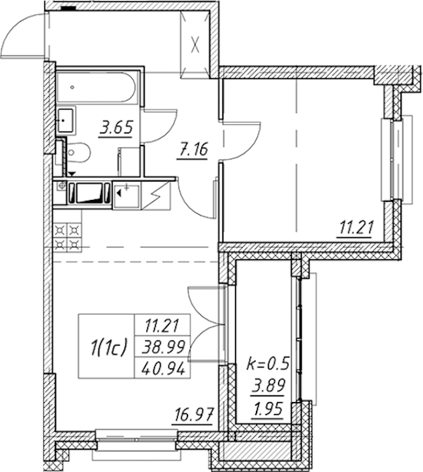 Однокомнатная квартира на 10-ом этаже 40,94 кв.м