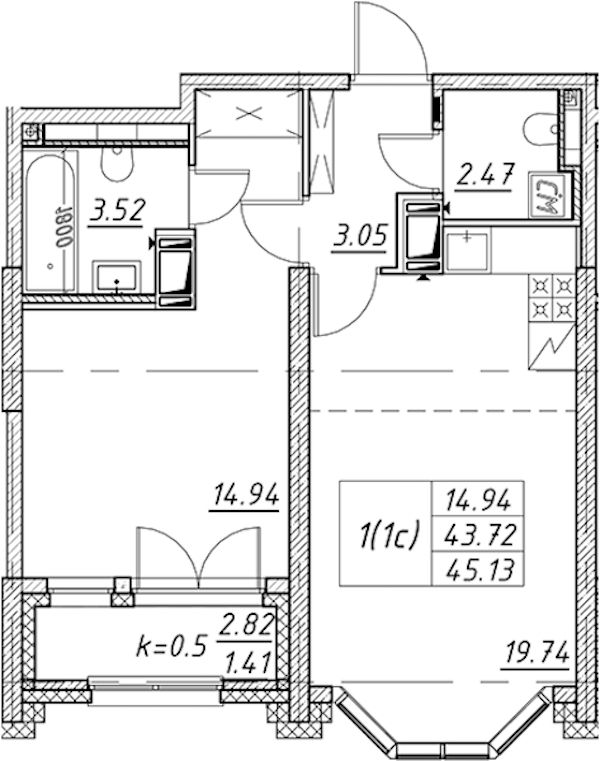• Площадь45,13 м2