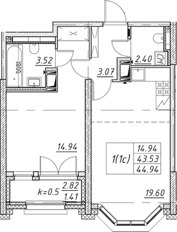 Однокомнатная квартира на 20-ом этаже 44,94 кв.м