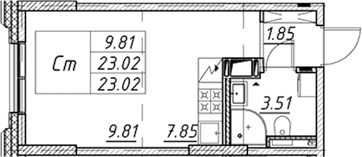 Квартира-студия на 3-ем этаже 23,02 кв.м
