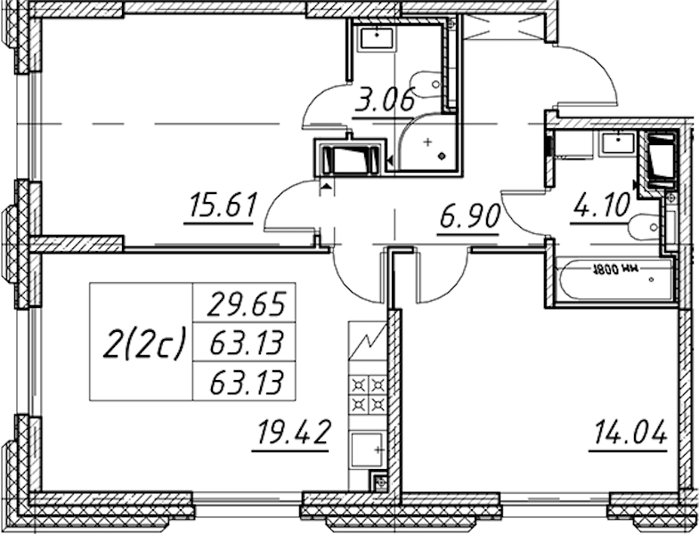 Двухкомнатная квартира на 3-ем этаже 63,13 кв.м