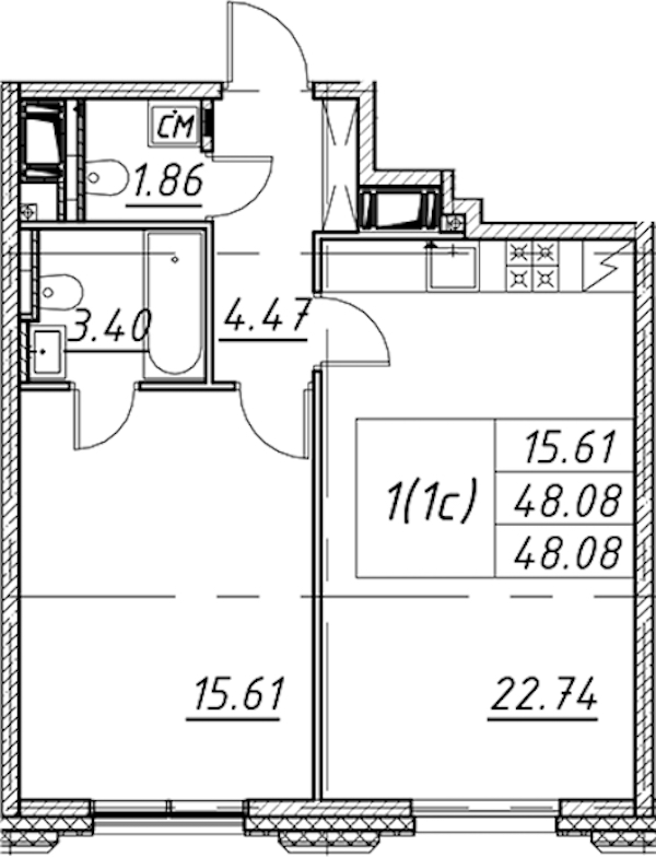 Однокомнатная квартира на 3-ем этаже 48,08 кв.м