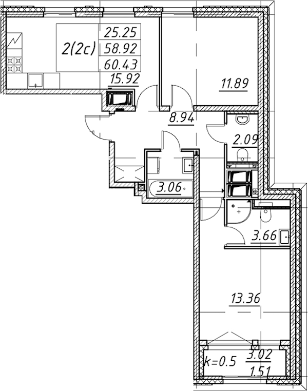 Двухкомнатная квартира на 6-ом этаже 60,43 кв.м