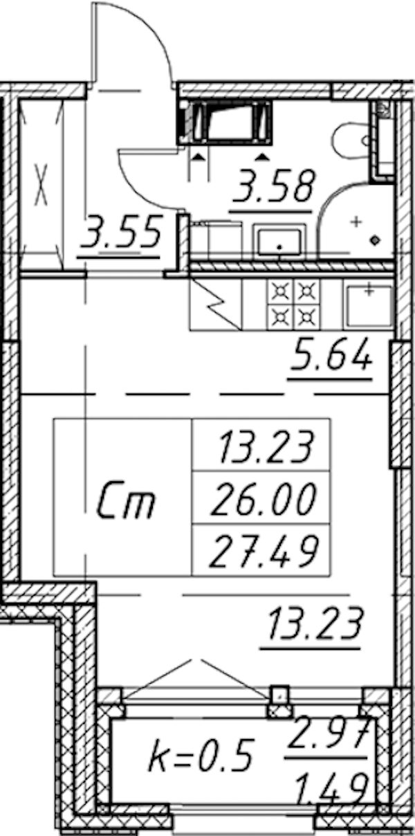 Квартира-студия на 10-ом этаже 27,49 кв.м
