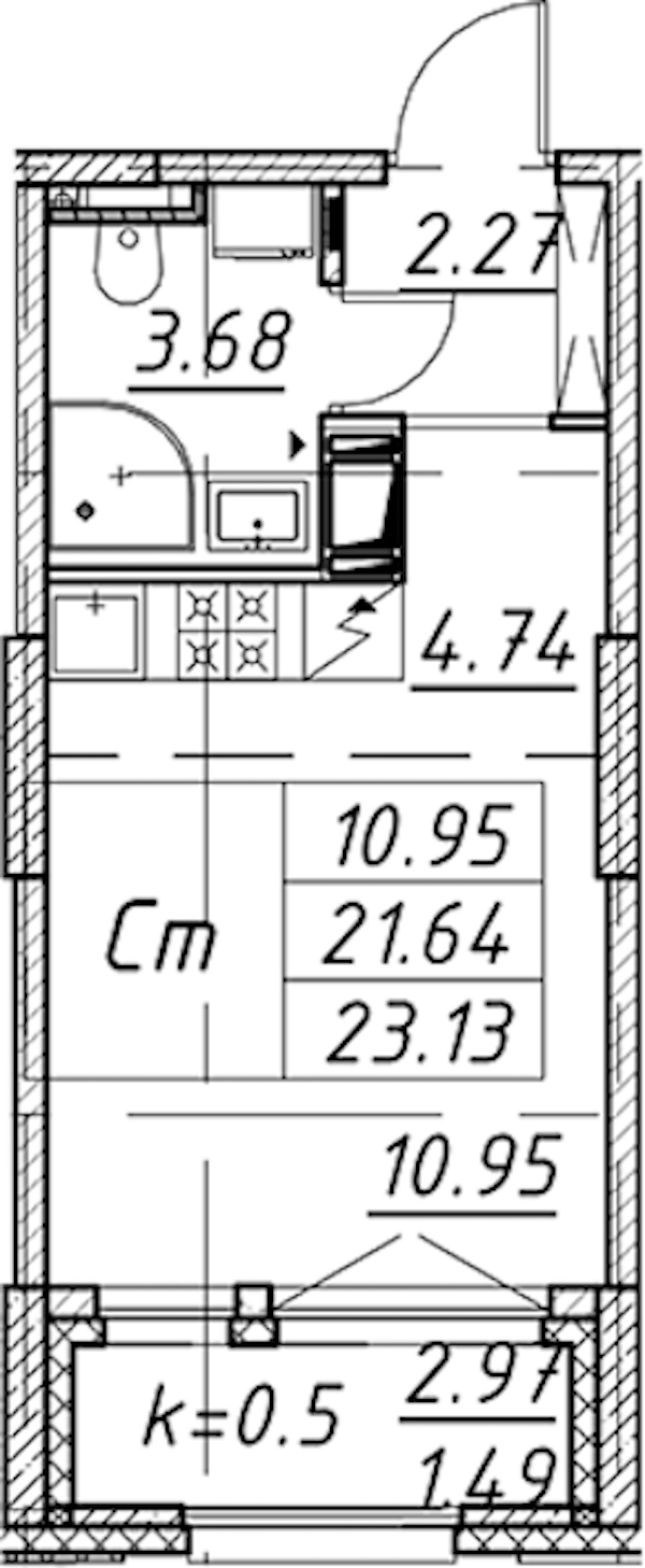 Квартира-студия на 11-ом этаже 23,13 кв.м