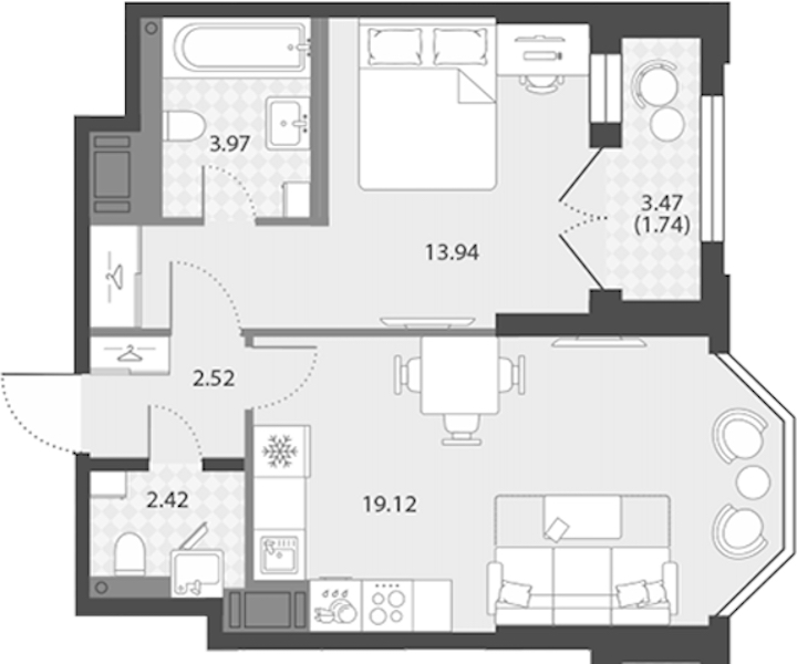 Однокомнатная квартира на 13-ом этаже 43,71 кв.м