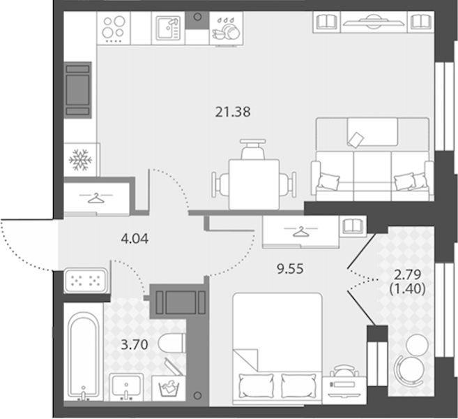 - Площадь кухни21,38 м2