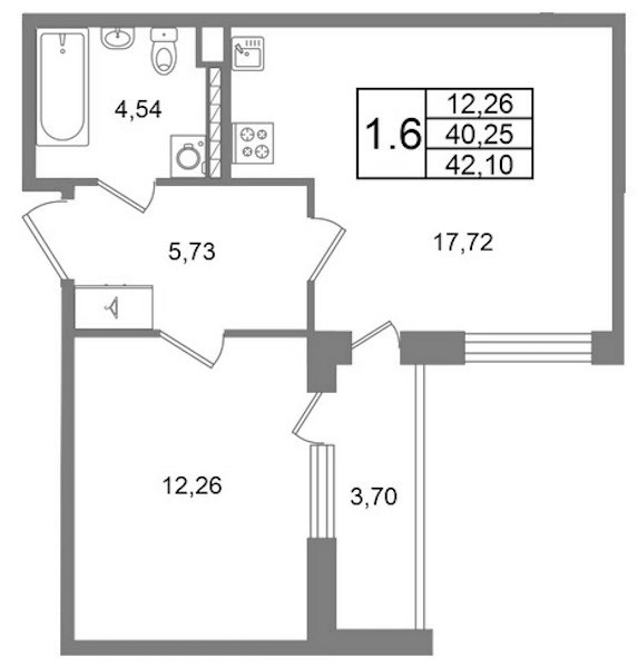Однокомнатная квартира на 4-ом этаже 40,25 кв.м