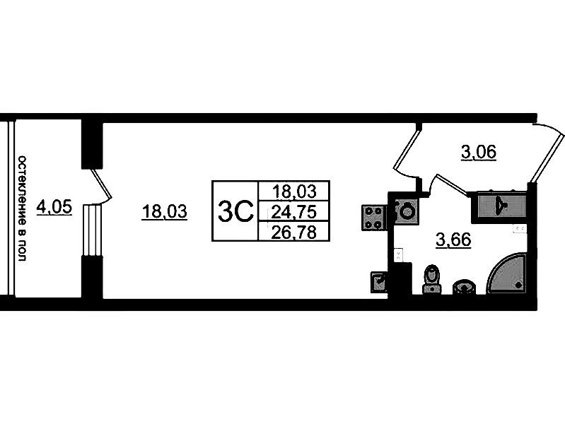 Квартира-студия на 3-ем этаже 24,75 кв.м