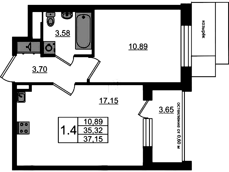 Однокомнатная квартира на 2-ом этаже 35,32 кв.м