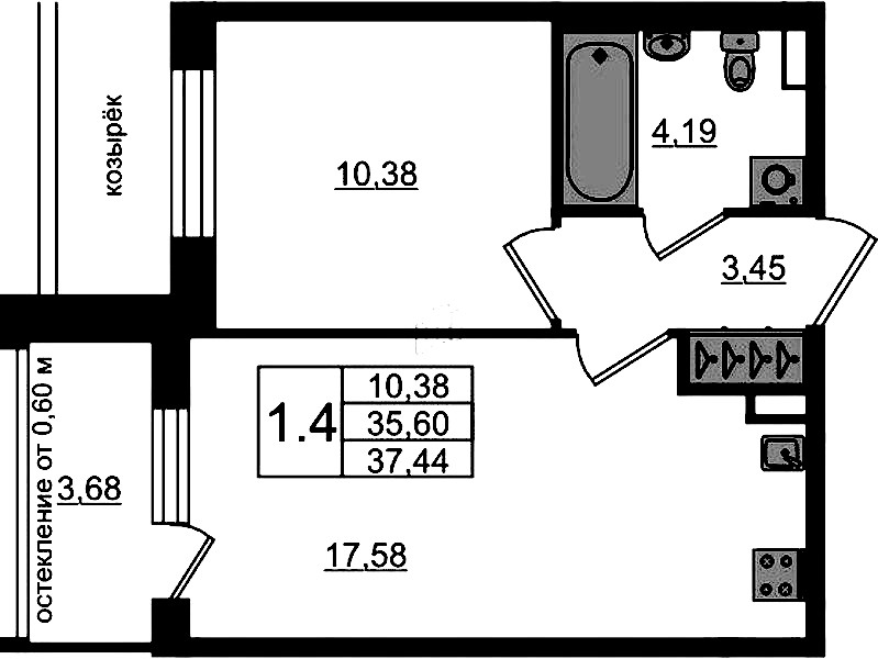 Однокомнатная квартира на 1-ом этаже 35,6 кв.м