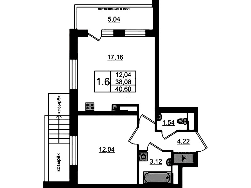 Однокомнатная квартира на 1-ом этаже 38,08 кв.м