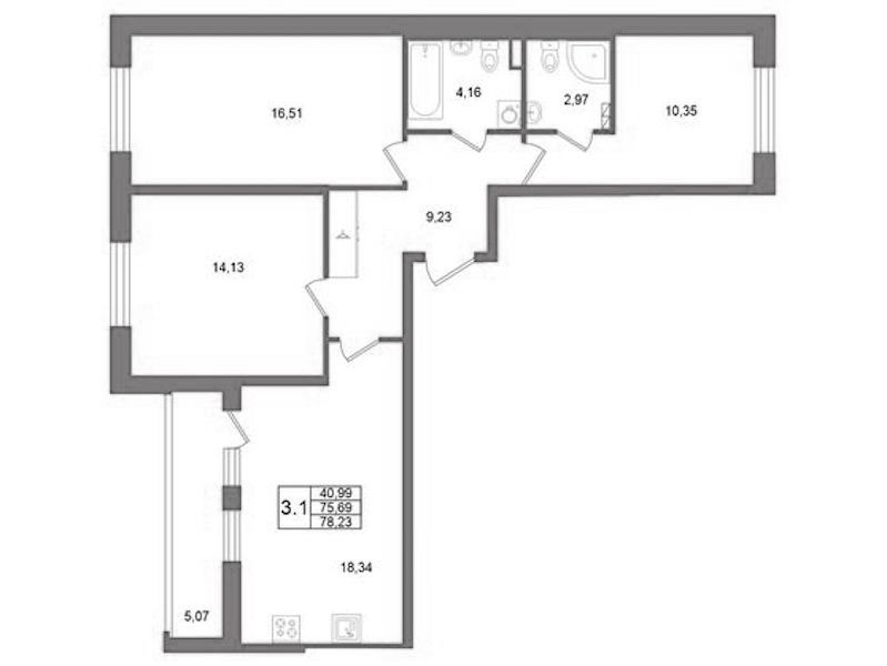 Трёхкомнатная квартира на 2-ом этаже 75,69 кв.м