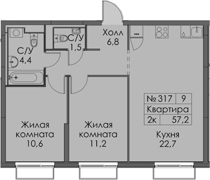 Двухкомнатная квартира на 5-ом этаже 57,2 кв.м