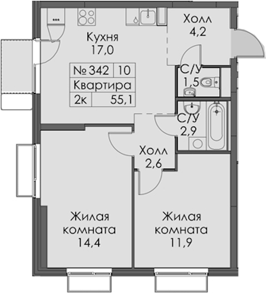 Двухкомнатная квартира на 6-ом этаже 55,1 кв.м
