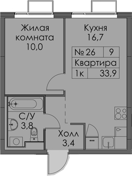 - Площадь33,9 м2