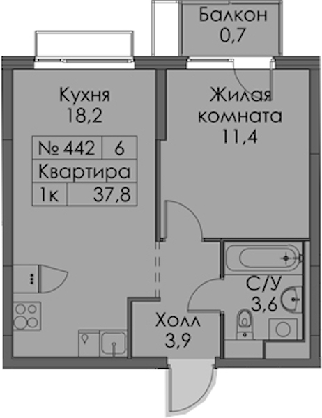 Однокомнатная квартира на 8-ом этаже 37,8 кв.м