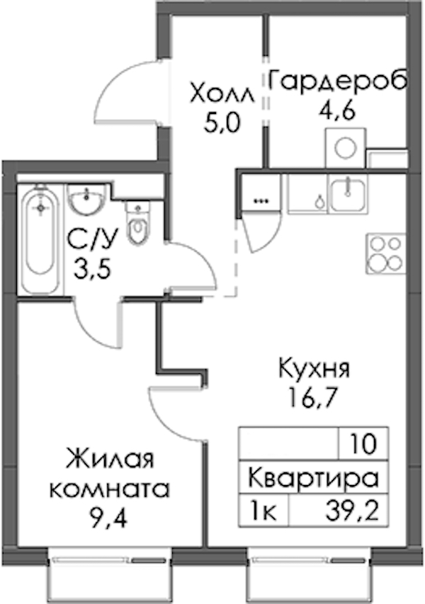 Однокомнатная квартира на 7-ом этаже 39,2 кв.м