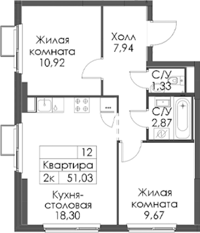 Двухкомнатная квартира на 22-ом этаже 51,03 кв.м