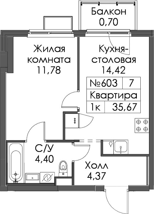 Однокомнатная квартира на 15-ом этаже 35,67 кв.м