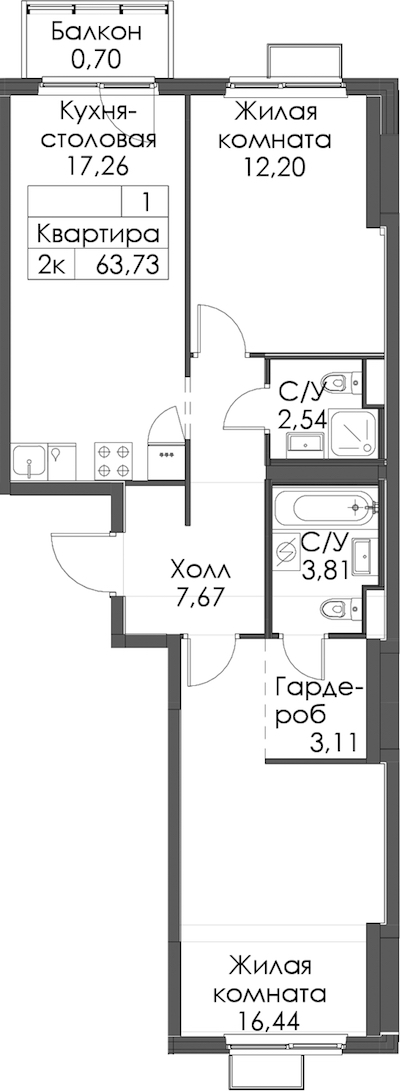 Двухкомнатная квартира на 13-ом этаже 63,73 кв.м