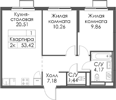 Двухкомнатная квартира на 14-ом этаже 53,42 кв.м