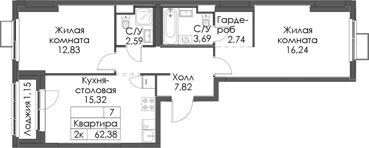 • Площадь62,38 м2