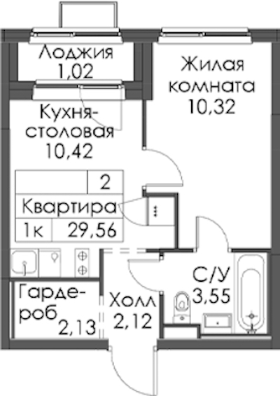 Однокомнатная квартира на 17-ом этаже 29,56 кв.м