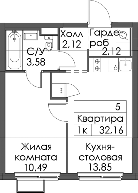 Однокомнатная квартира на 8-ом этаже 32,16 кв.м