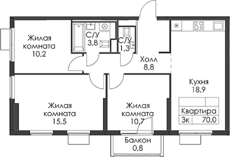 - Площадь кухни18,9 м2