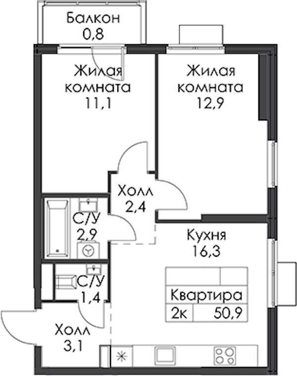 Двухкомнатная квартира на 21-ом этаже 50,9 кв.м